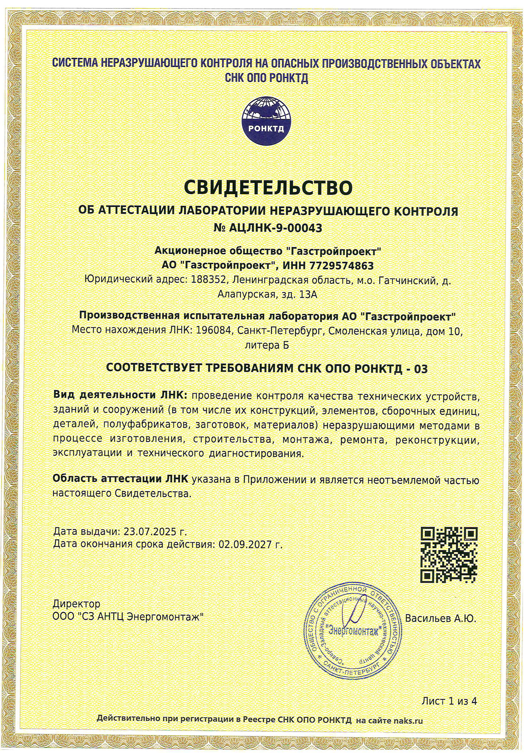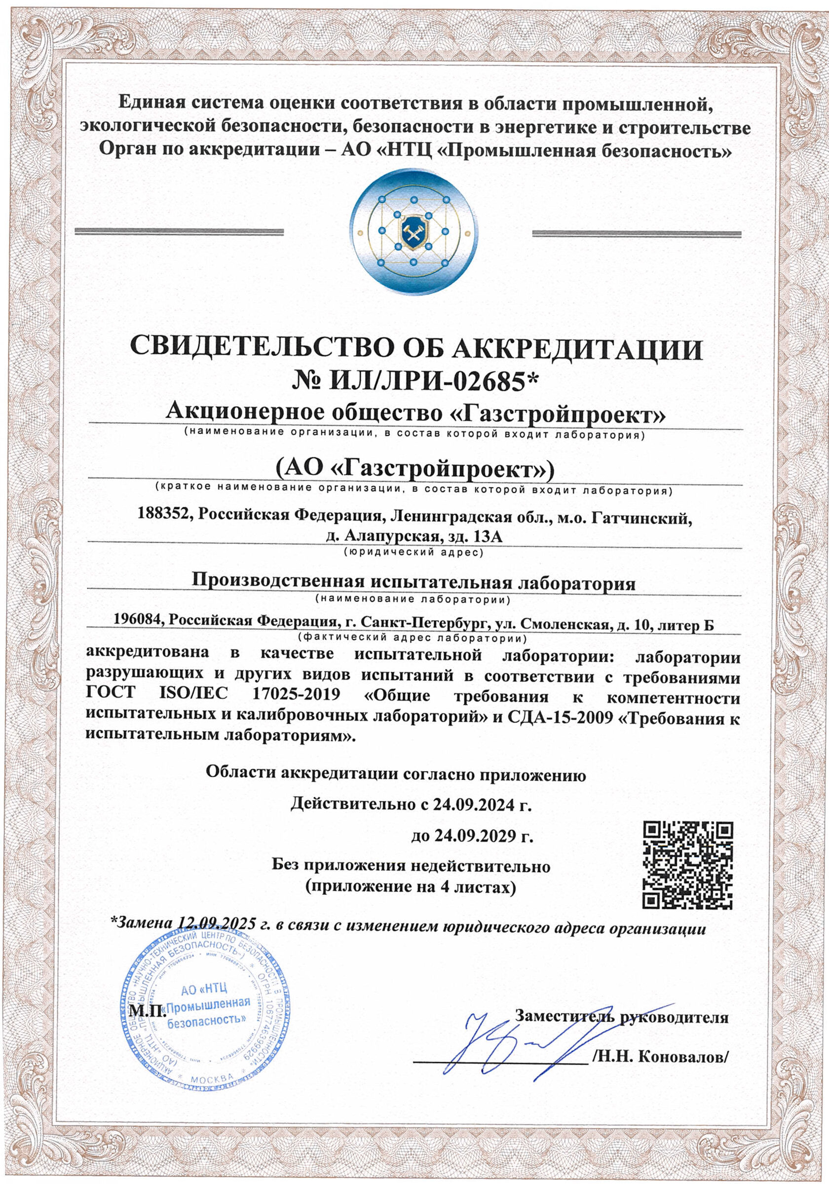 В составе АО «Газстройпроект» организована производственная испытательная лаборатория, способная обеспечить высокий уровень контроля качества при строительстве, реконструкции, капитальном ремонте и эксплуатации опасных производственных объектов. Лаборатория укомплектована штатом специалистов II и III уровней квалификации.