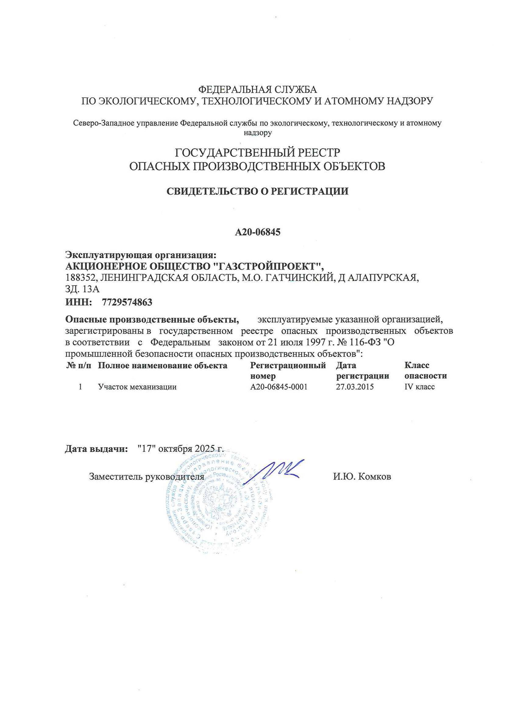 Свидетельство регистрации опасных производственных объектов № А20-06845 от 17.10.2025